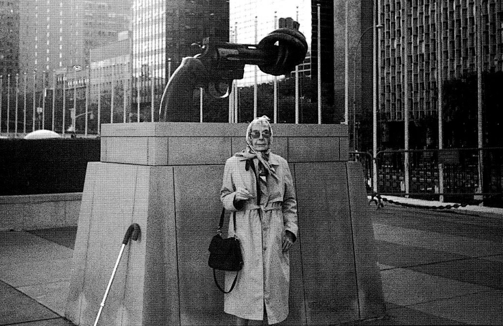 Eileen Egan outside the United Nations building, New York City. The photograph was taken by Ian J Currie in October, 1999 and shows Eileen Egan beneath a monument of a pistol with a knotted barrel, a symbol of nonviolence. Ian say’s of the photograph, “I remember feeling when taking it, how significant it was to have such a symbol of peace alongside a woman of peace”.