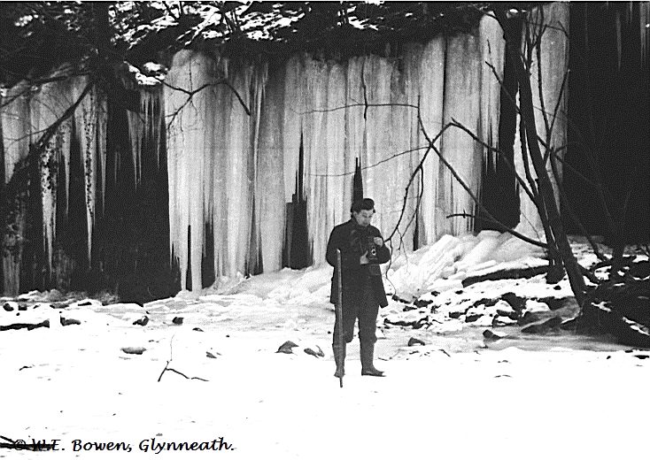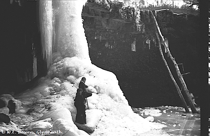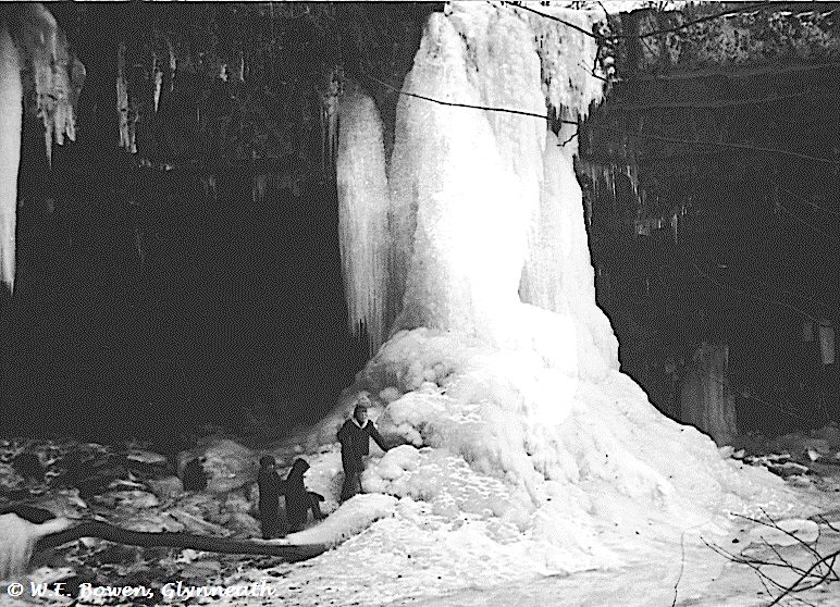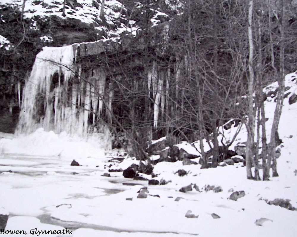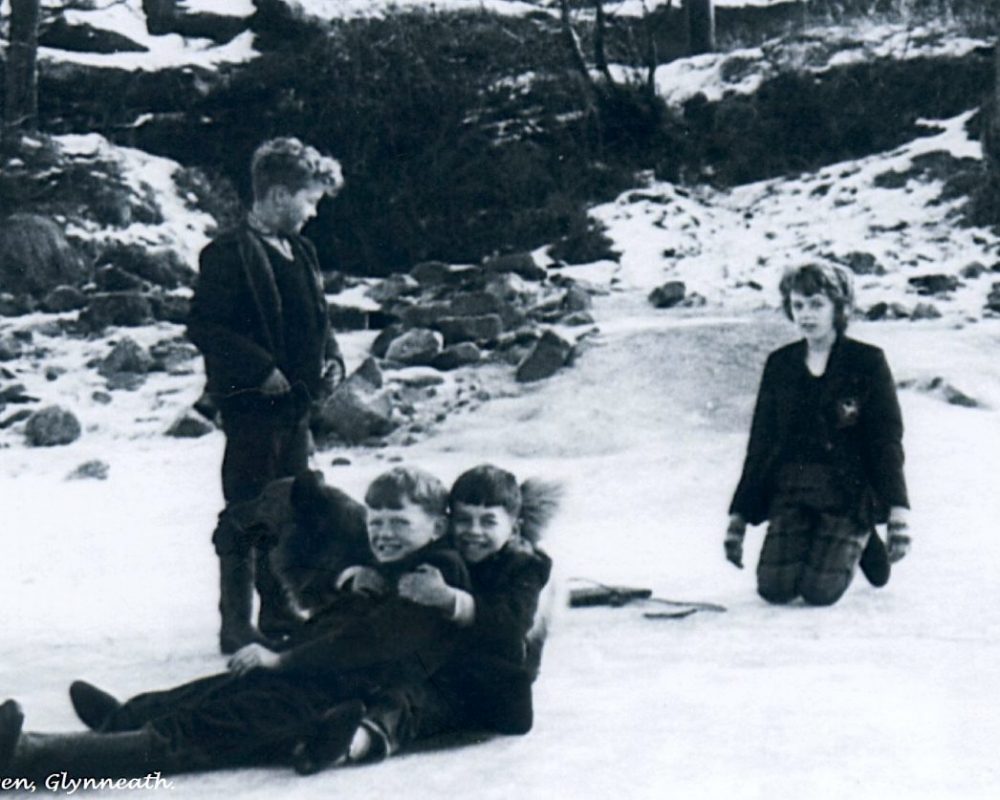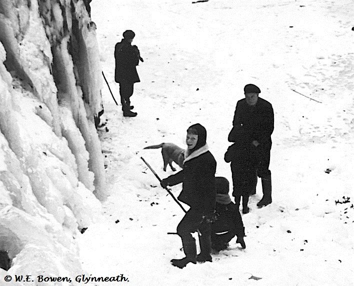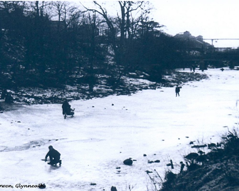 The big photo shows the river Neath completely frozen over, I am in the foreground of the photo on my knees, down by the river bridge you can see a number of people on the ice.