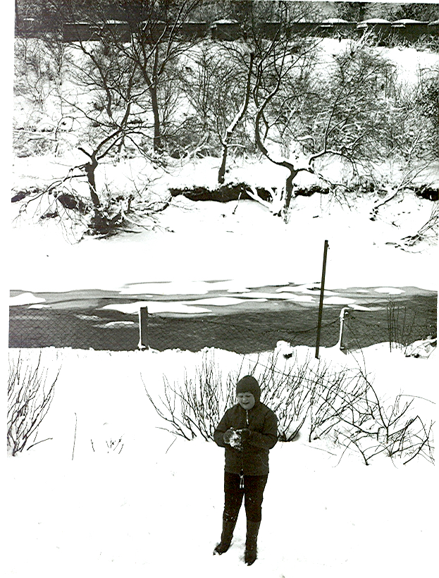 You can see to the left my sister in our garden around the New Year with the snow on the ground and the River Neath starting to freeze over.