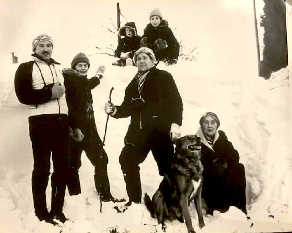 Mansel and Rita Hobbs with Linda, Silvano, Matthew, Nathan and Fred the dog. Photo taken in January 1982 , the road had only been cleared up as far as Lewis’, Fforch Coch bungalow. Mansel is stood on the road while the boys are on top of the snow.